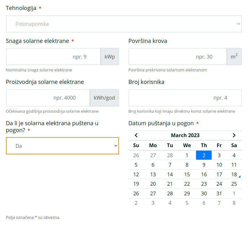 - Potrebno upisati snagu solarne instalacije (kWp).